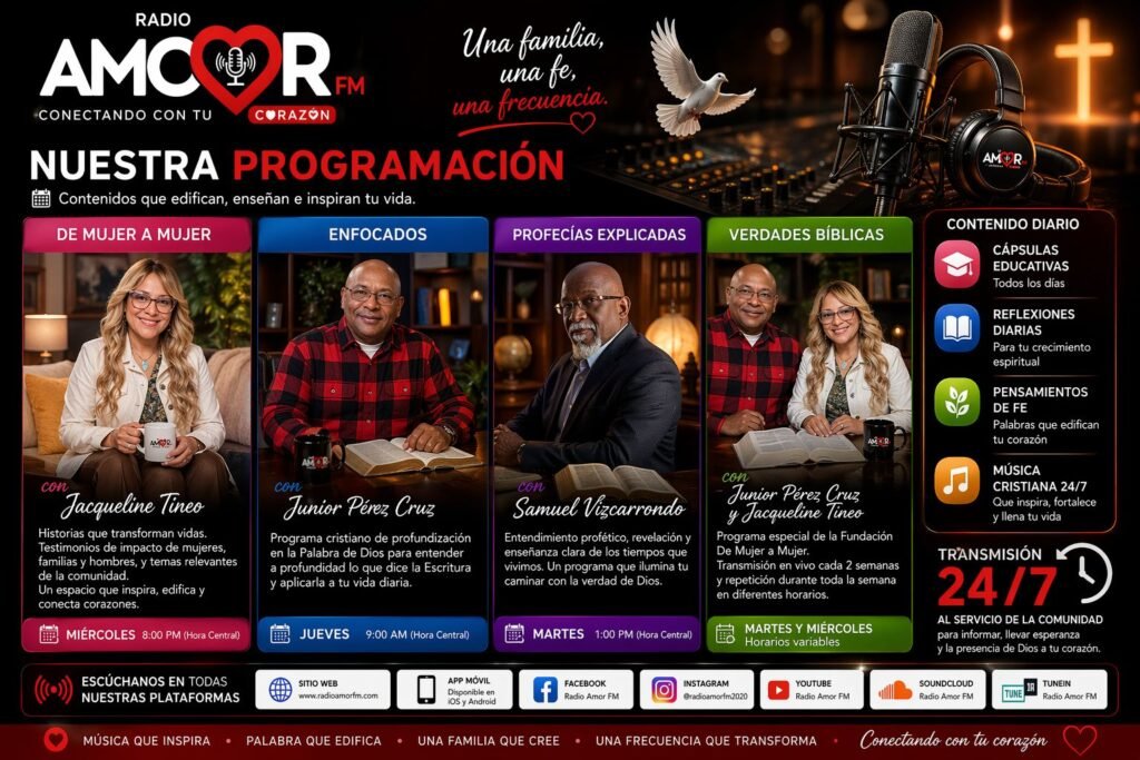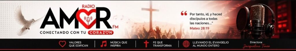 Radio Amor FM se levanta como un espacio para exaltar los valores espirituales, promover principios sanos y acompañar a cada persona en su caminar de fe. Su eslogan, “Conectando con tu corazón”, expresa la esencia de esta emisora: tocar vidas, ministrar al alma y acercar a las personas al corazón de Dios.